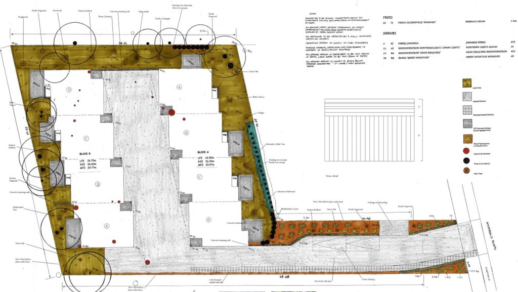 The currently proposed new build will require the removal of 33 trees including 32 bylaw protected trees (90% of those on site), 18 of which are Garry Oaks and 5 are Douglas Fir.