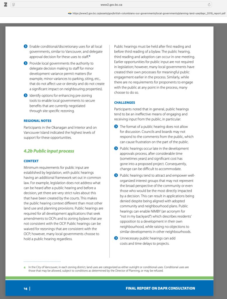 The Development Approvals Process Review (DAPR, 2019) is a provincial Government of British Columbia report that examines how local governments approve development projects. It identifies barriers to faster housing delivery—such as lengthy timelines, regulatory complexity, and public hearing processes—and recommends reforms to streamline approvals. The report places particular emphasis on improving efficiency, reducing delays, and addressing what it characterizes as unrepresentative or obstructive public input, including opposition framed as “NIMBY,” ultimately informing later policy and legislative changes such as the removal or limitation of public hearings.